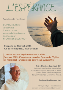 L’orateur sera le frère Christian Eeckhout, prieur du couvent des Dominicains à Louvain-la-Neuve, théologien, animateur de retraites et de pèlerinages bibliques. Ayant vécu à Jérusalem, il a enseigné à la prestigieuse école biblique et archéologique de Jérusalem. Il est un guide expérimenté des lieux saints.