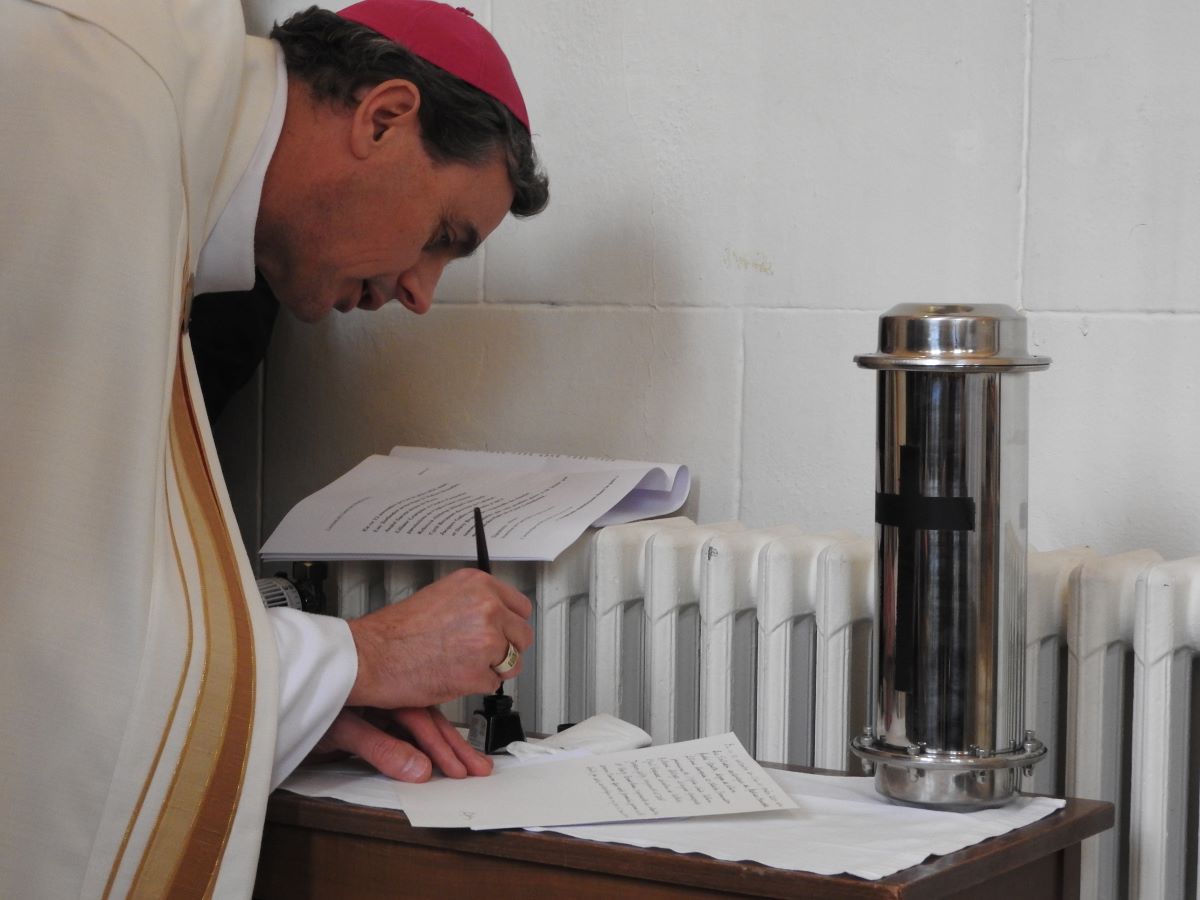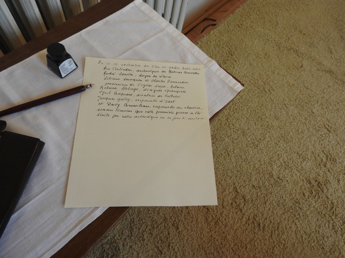 Après cette liturgie de la Parole, un document, reprenant la date de la bénédiction et co-signé par des personnes en responsabilités dont Mgr Terlinden et Rebecca Alsberge a été inséré dans un tube en cuivre. Celui-ci sera ensuite intégré dans l’autel de la chapelle.