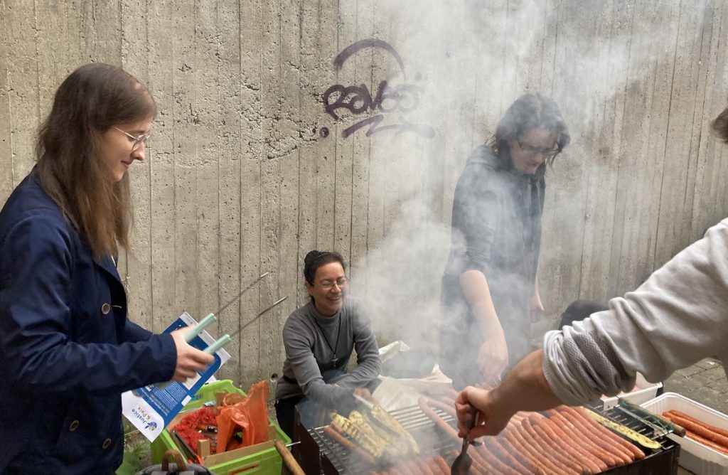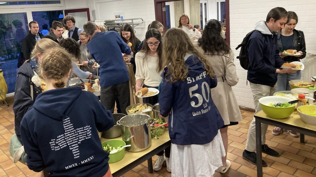 S’en est suivi un long repas très joyeux : nous étions autant d’étudiants que d’habitants, les familles des jubilaires étaient présentes aussi. Tout cela sous le mode auberge espagnole, le Don Boskot gérant le barbecue comme des pros.