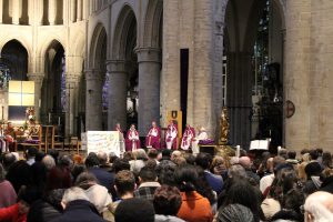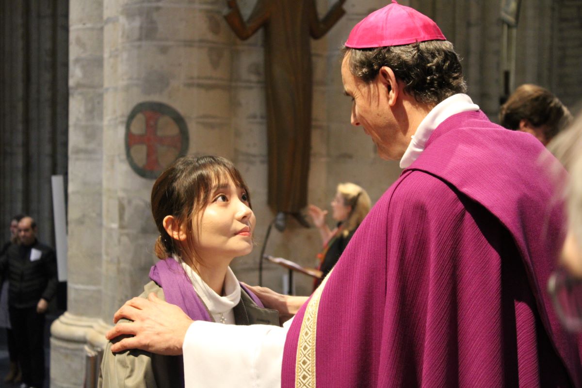 15h, la célébration débute. Un peu plus de cent catéchumènes, leurs accompagnateurs, parrains, marraines, familles, prêtres et paroissiens de leurs communautés paroissiales remplissent la cathédrale. Le mot d’accueil parle du baptême que ces adultes recevront à la Vigile pascale dans leur paroisse comme d’un tremplin sur un chemin de disciple.