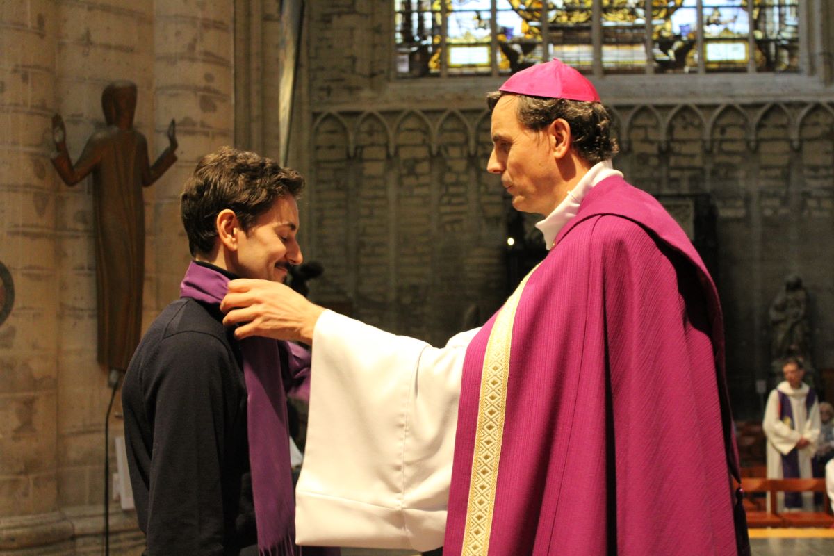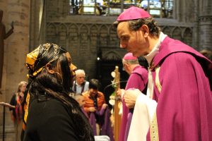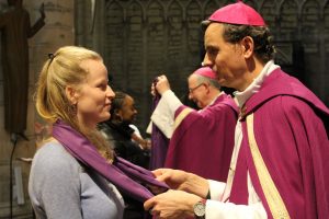 Mgr Terlinden et Mgr Vanhoutte remettent à chacun une écharpe violette tout en prenant le temps d’avoir une parole personnelle. Cette écharpe violette marque l’entrée dans le carême baptismal, ultime temps avant de recevoir les trois sacrements de l’initiation chrétienne à Pâques. Les catéchumènes se dirigent ensuite vers les registres où ils inscrivent leur nom. Toute cette étape liturgique se veut signe de l’engagement libre de ces adultes et de leur accueil par l’Eglise.