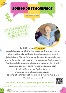 En 2012, la vie d’Emmanuel bascule lorsque sa fille Mayline, âgée de 3 ans, est victime d’un accident d’étouffement que les médecins jugent irrémédiable. Alors qu’elle est sur le point de perdre la vie, un miracle survient, attribué à l’intercession de Pauline Jaricot: Mayline sort de son coma et recouvre la santé. Ce miracle, reconnu également par la monde médical, conduit à la béatification de Pauline Jaricot. Emmanuel reviendra sur sa découverte de la foi et comment cet événement a transformé sa vie. Un récit bouleversant !