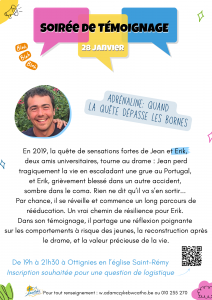En 2019, la quête de sensations fortes de Jean et Erik, deux amis universitaires, tourne au drame : Jean perd tragiquement la vie en escaladant une grue au Portugal, et Erik, grièvement blessé dans un autre accident, sombre dans le coma. Rien ne dit qu’il va s’en sortir… Par chance, il se réveille et commence un long parcours de rééducation. De fait, un vrai chemin de résilience pour Erik. Dans son témoignage, il partage une réflexion poignante sur les comportements à risque des jeunes, la reconstruction après le drame, et la valeur précieuse de la vie.