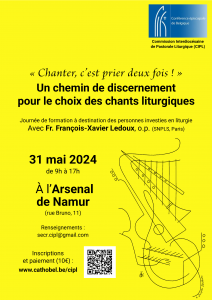 Nous avons fait appel au Père François-Xavier Ledoux, op, qui collabore au département musique du Service national de pastorale liturgique et sacramentelle de France. Il nous aidera à définir des critères afin choisir les chants qui conviennent le mieux pour nos différentes assemblées au fil de l’année. Cette journée aura lieu à l’Arsenal de Namur. Elle est ouverte à toutes les personnes investies en liturgie ou intéressées par cette question. N’hésitez pas à transmettre l’information à vos choristes et à vos musiciens. Le prix de la participation à la journée s’élève à 10 euros.