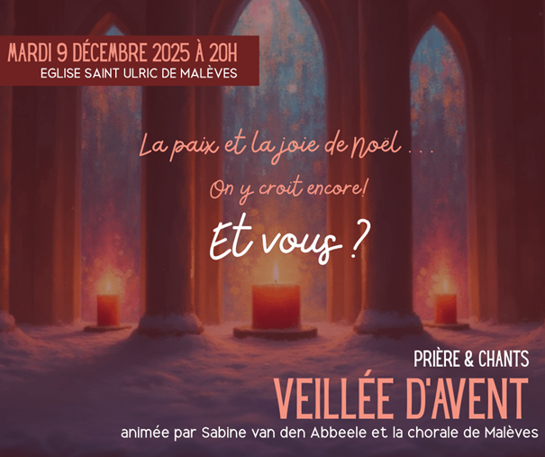 Mardi 9 décembre à 20h à l’église Saint-Ulric de Malèves, participez à une veillée d’Avent sur le thème de la paix et de la joie de Noël. Tous les détails sur le site de la paroisse.
